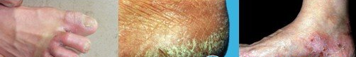(3)鱗屑角化型:癥狀是足底、足緣、足跟部皮膚腳趾增厚、粗糙、脫屑,鱗屑成片狀或小點狀,反復脫落。冬季趾縫間皮膚發(fā)生裂隙,夏季產生水皰,有痛感。常因搔抓引起繼發(fā)性感染,并發(fā)膿包瘡、淋巴管炎、淋巴結炎、蜂窩組織炎、丹毒、敗血癥等疾患。