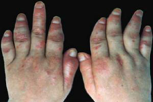4、導致患者關節(jié)損害:關節(jié)型銀屑病患者除了具有皮膚表現(xiàn)外,還可出現(xiàn)關節(jié)腫大疼痛、活動受限、晨僵、有積液或變形等類風濕關節(jié)炎的癥狀。