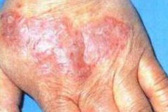 4、手部濕疹:發(fā)生于手掌部。易浸潤(rùn)增厚過(guò)度角化形成皸裂。手指端濕疹常反復(fù)發(fā)生水皰、結(jié)痂增厚、脫屑,累及甲床部可影響指甲發(fā)育致使甲板粗糙,凹陷不平。接觸肥皂水、洗衣粉等,常使?jié)裾罴又亍?/p>